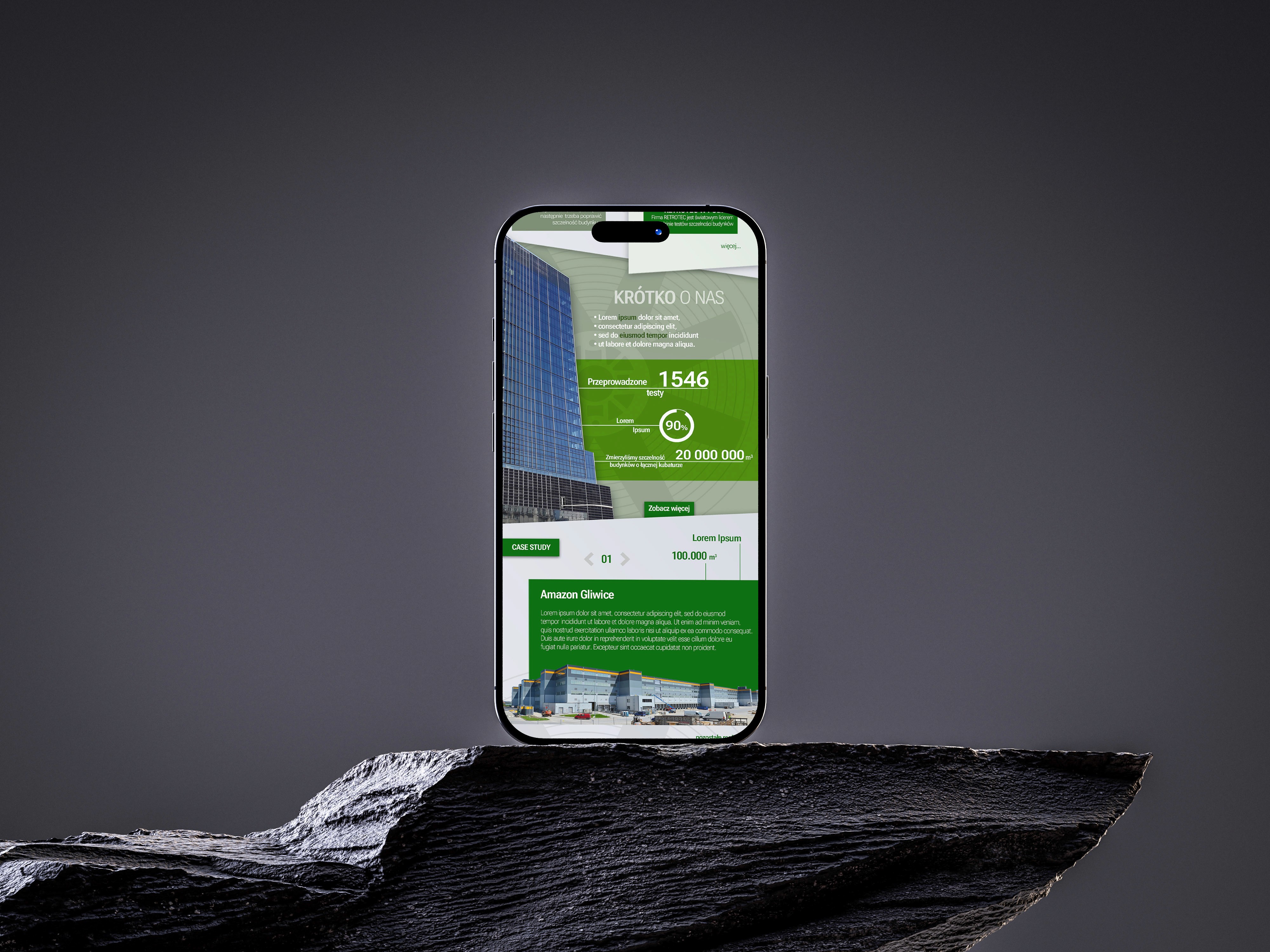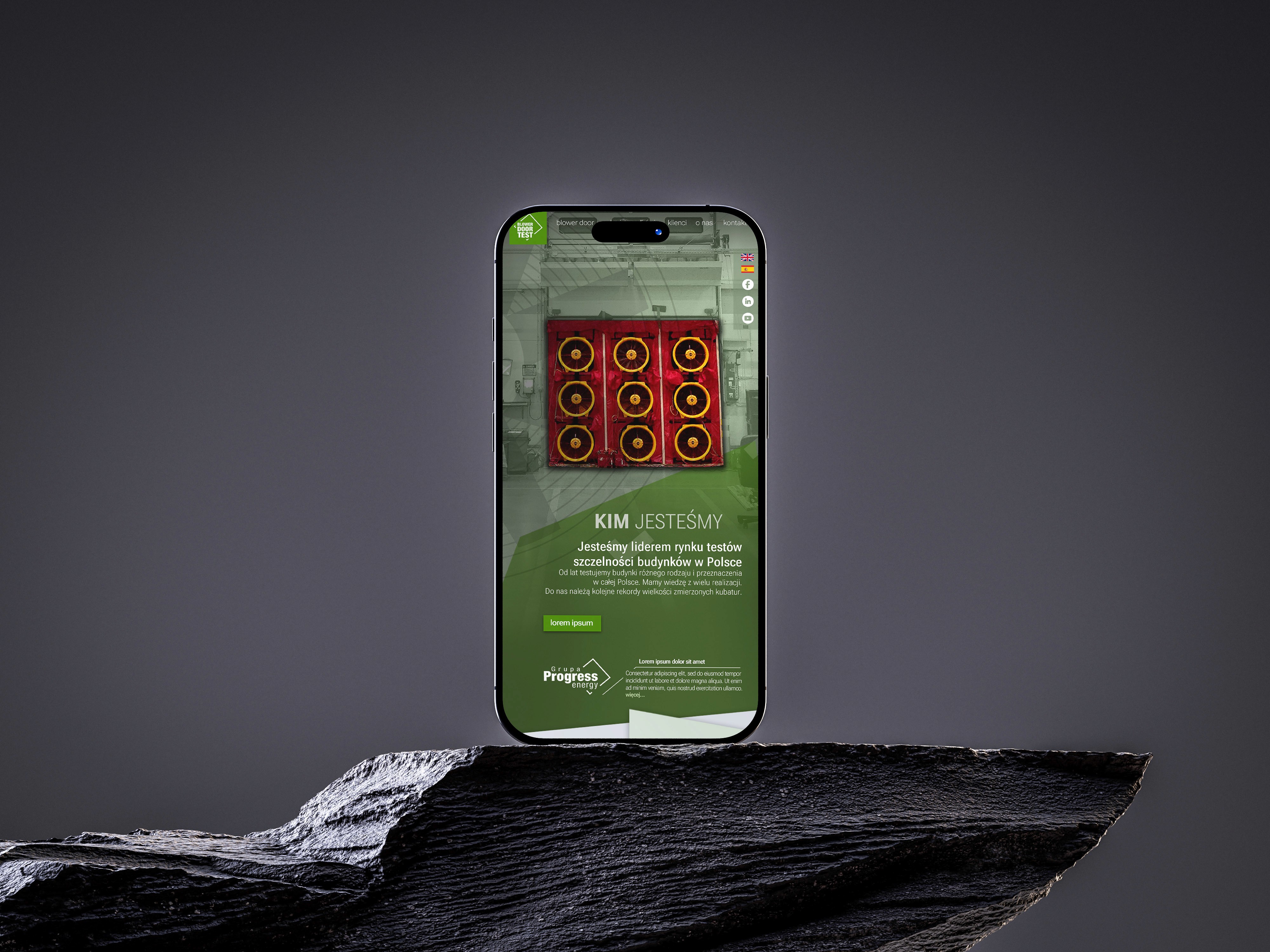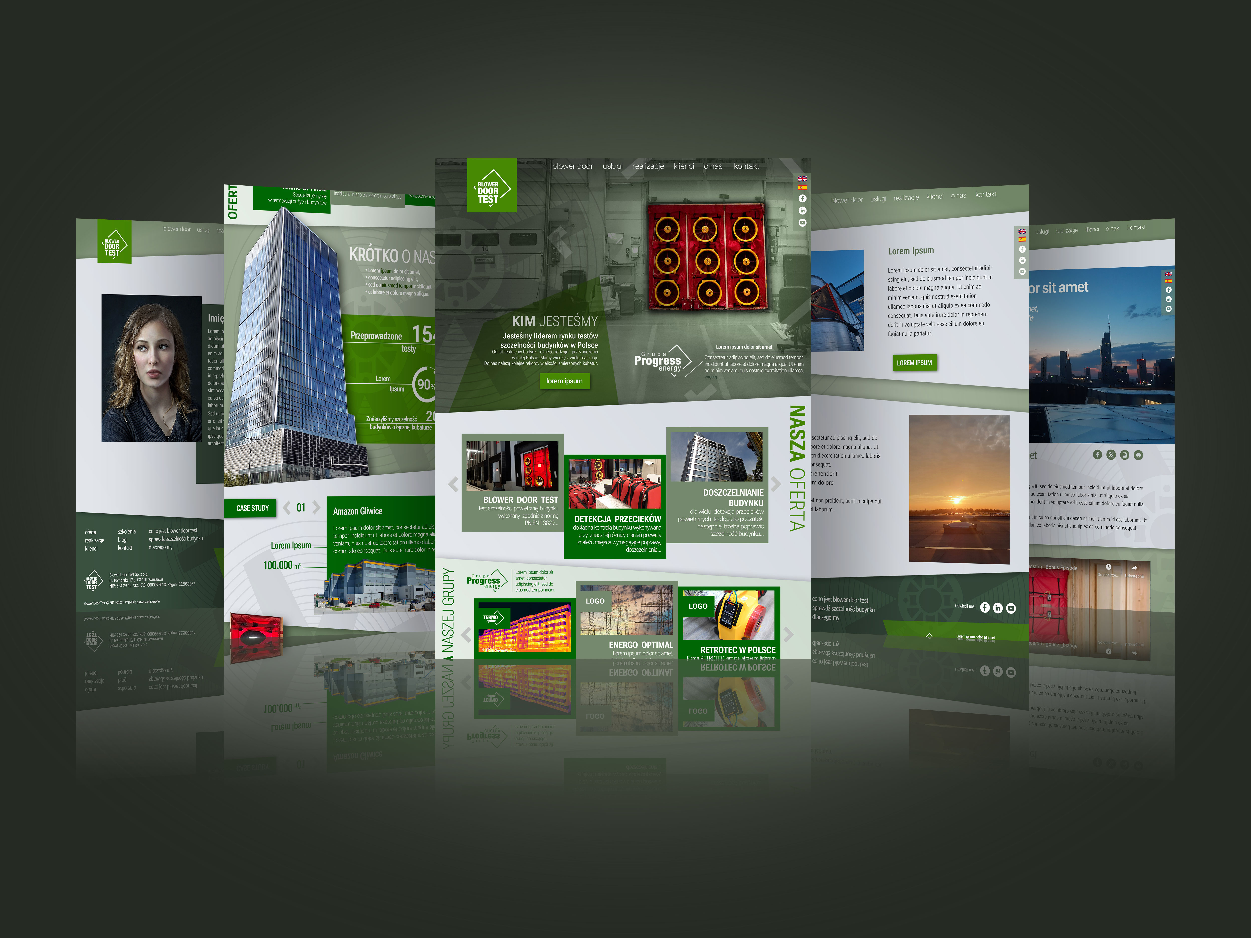 Projekt zakładał powstanie layoutu strony internetowej dla firmy specjalizującej się w kontroli szczelności budynków. Projekt w odcieniach zieleni został wzbogacony o wycięte zdjęcia budynków oraz wiatraków niezbędnych do przeprowadzania testów. Dodatkowo motyw wiatraka stał się wyraźnym elementem tła. Dynamiki dodają geometryczne często ukośne formy stanowiące podział sekcji strony.