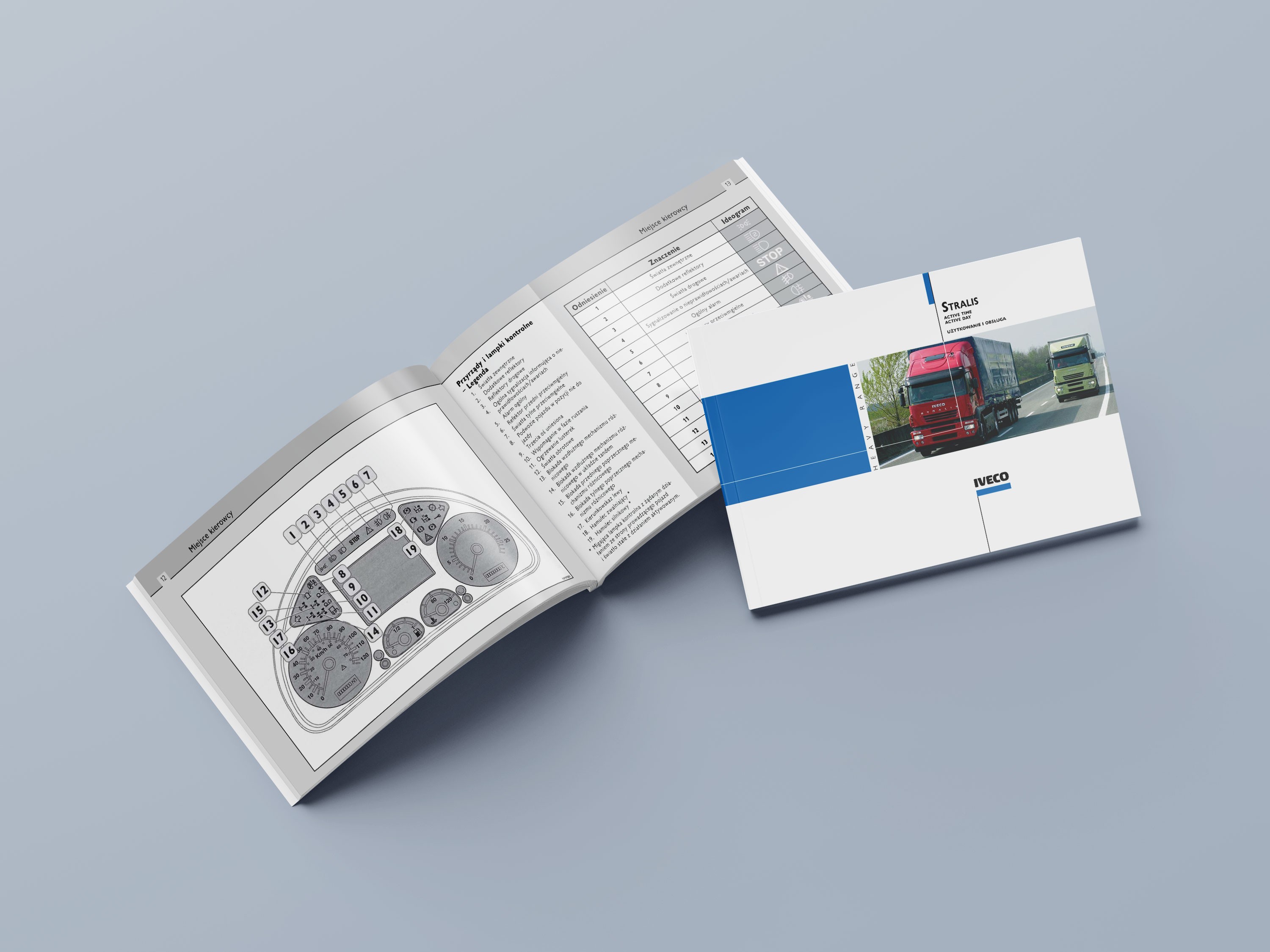 W ramach współpracy z firmą Iveco przygotowaliśmy instrukcje oraz plakaty promocyjne. Chcieliśmy aby odbiór całości korespondował z wizerunkiem solidnej marki przeznaczonej dla profesjonalistów.