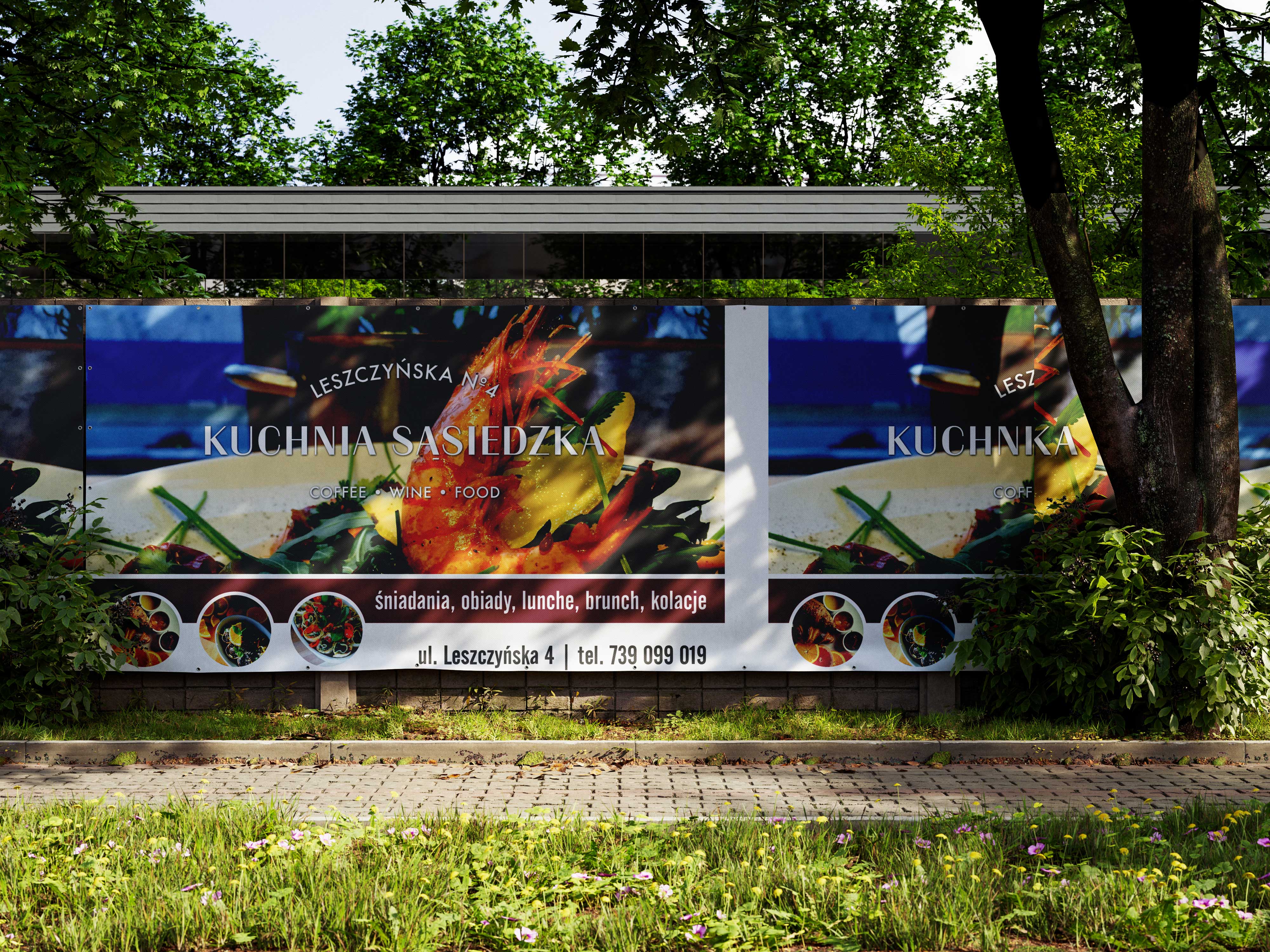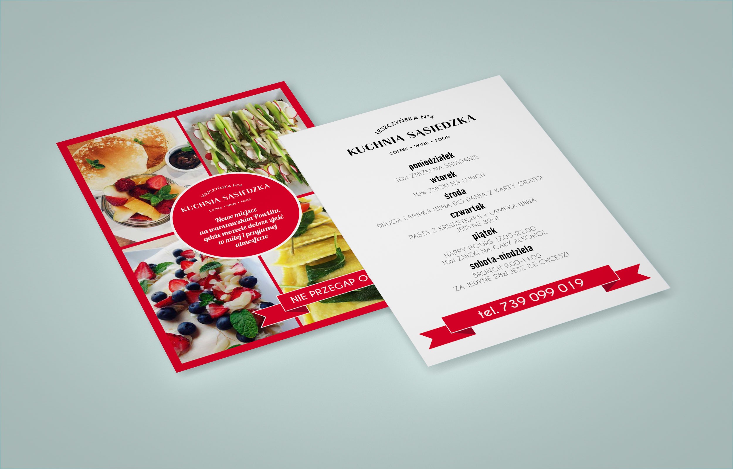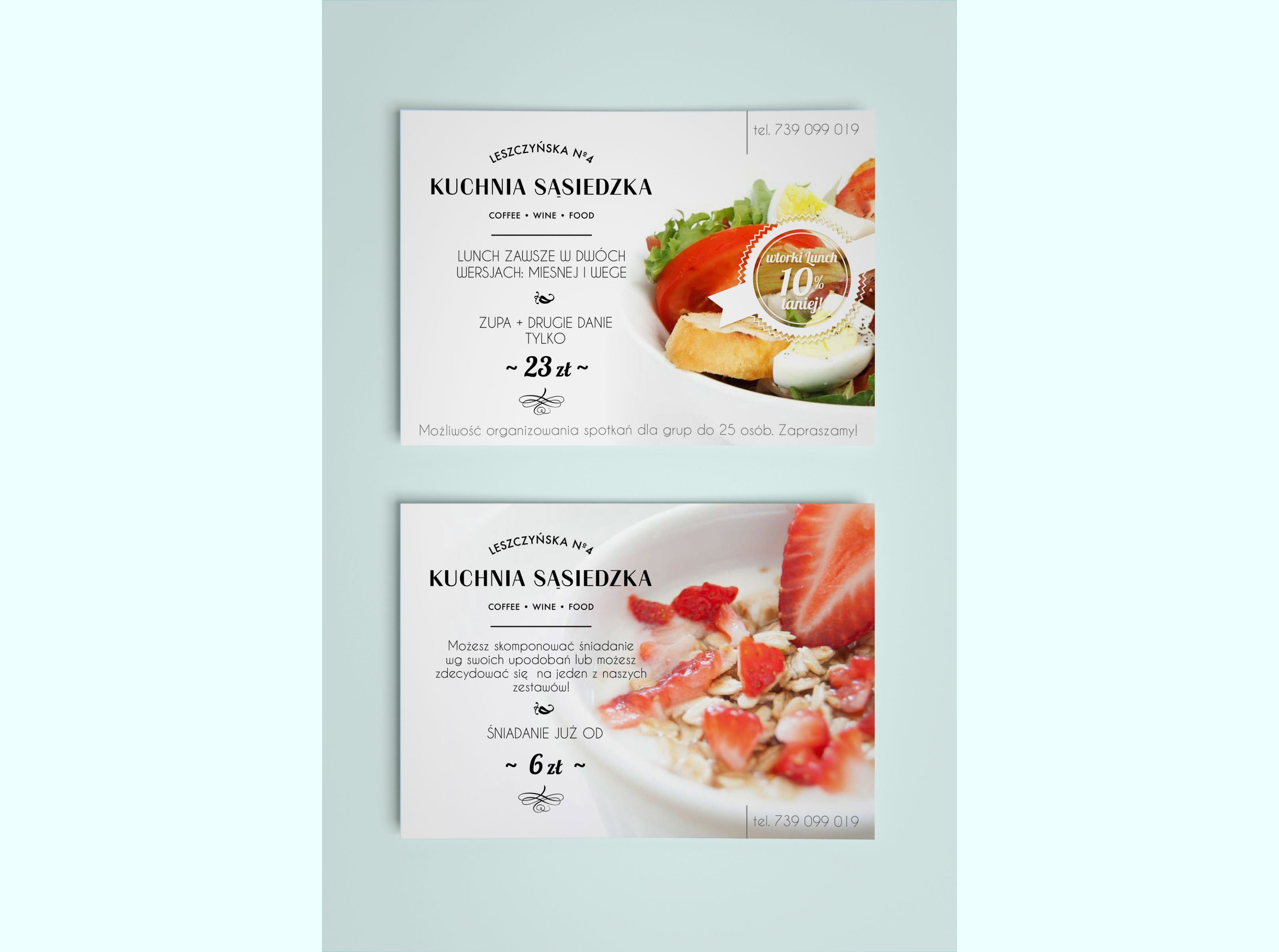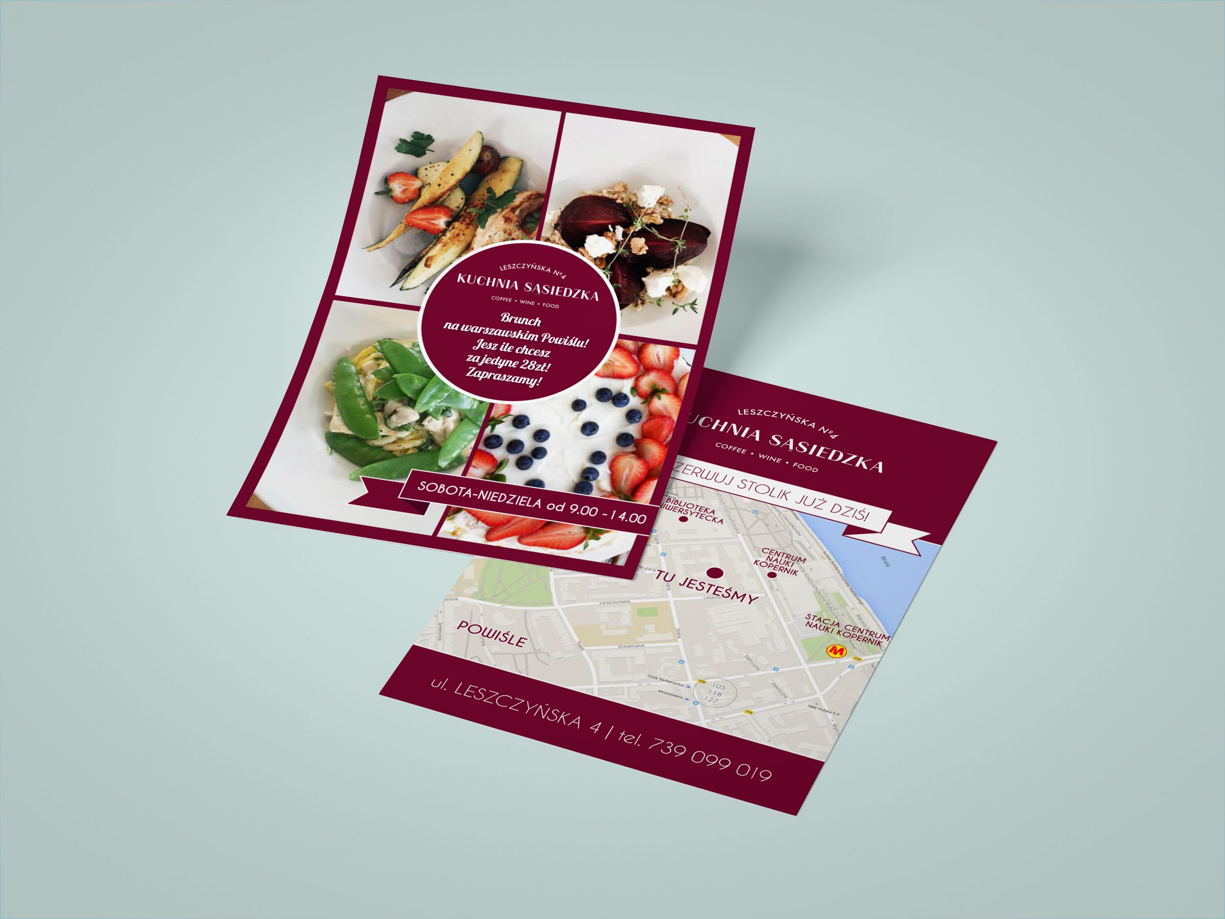 Projekt materiałów promocyjnych dla restauracji "Kuchnia sąsiedzka" nawiązuje do charakteru tego przytulnego, lokalnego miejsca, stawiającego na domową atmosferę i kuchnię opartą na świeżych, sezonowych składnikach.