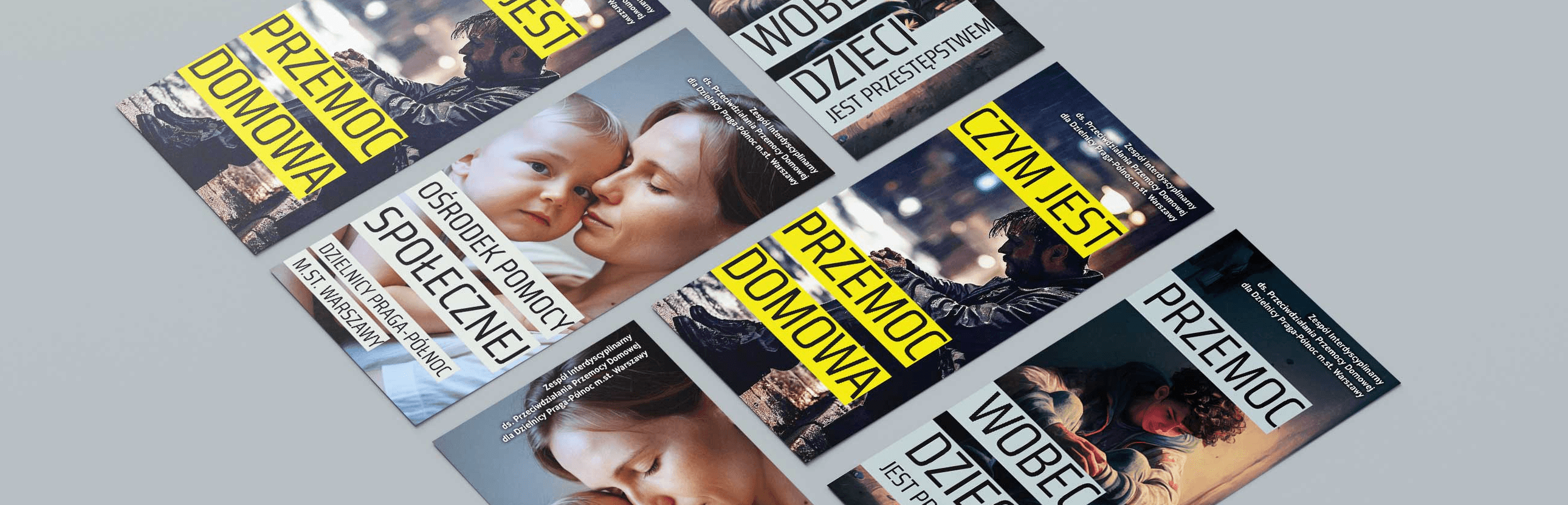 W projekcie tym przygotowaliśmy serię ulotek dla Ośrodka Pomocy Społecznej na warszawskiej Pradze. Spotkaliśmy się z problemem w jaki sposób ukazać trudne tematy przemocy w takiej formie aby zamiast przytłoczyć odbiorców, zmotywować ich do pozytywnych działań. Postawiliśmy na nowoczesny design i jednocześnie stonowane grafiki.