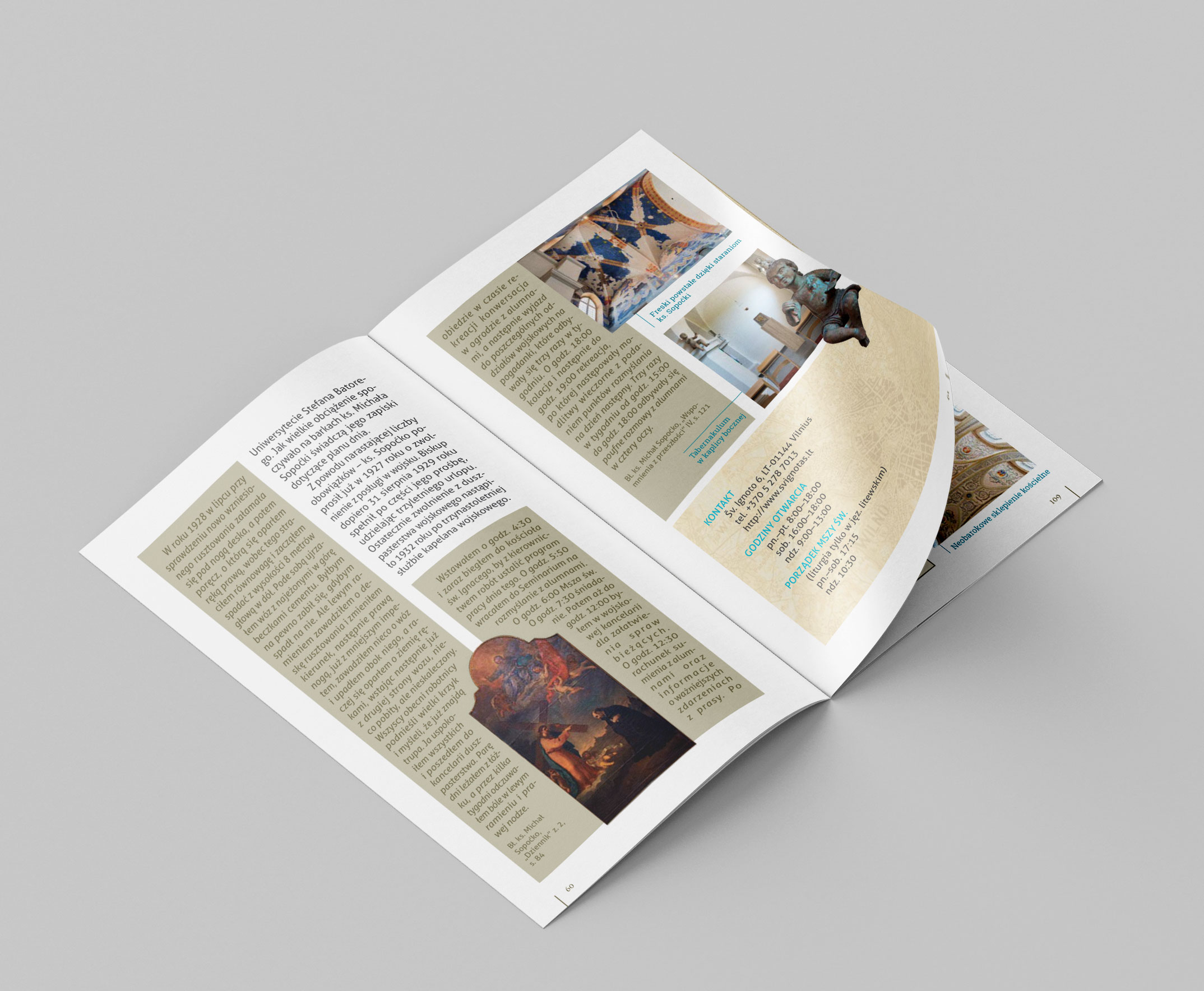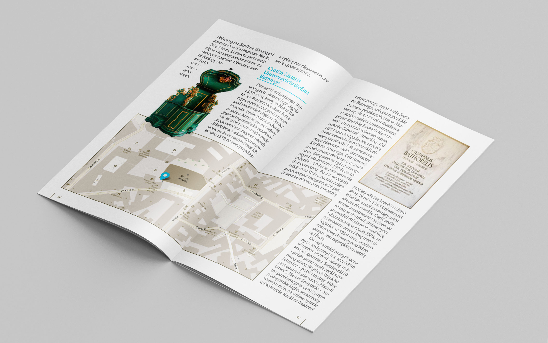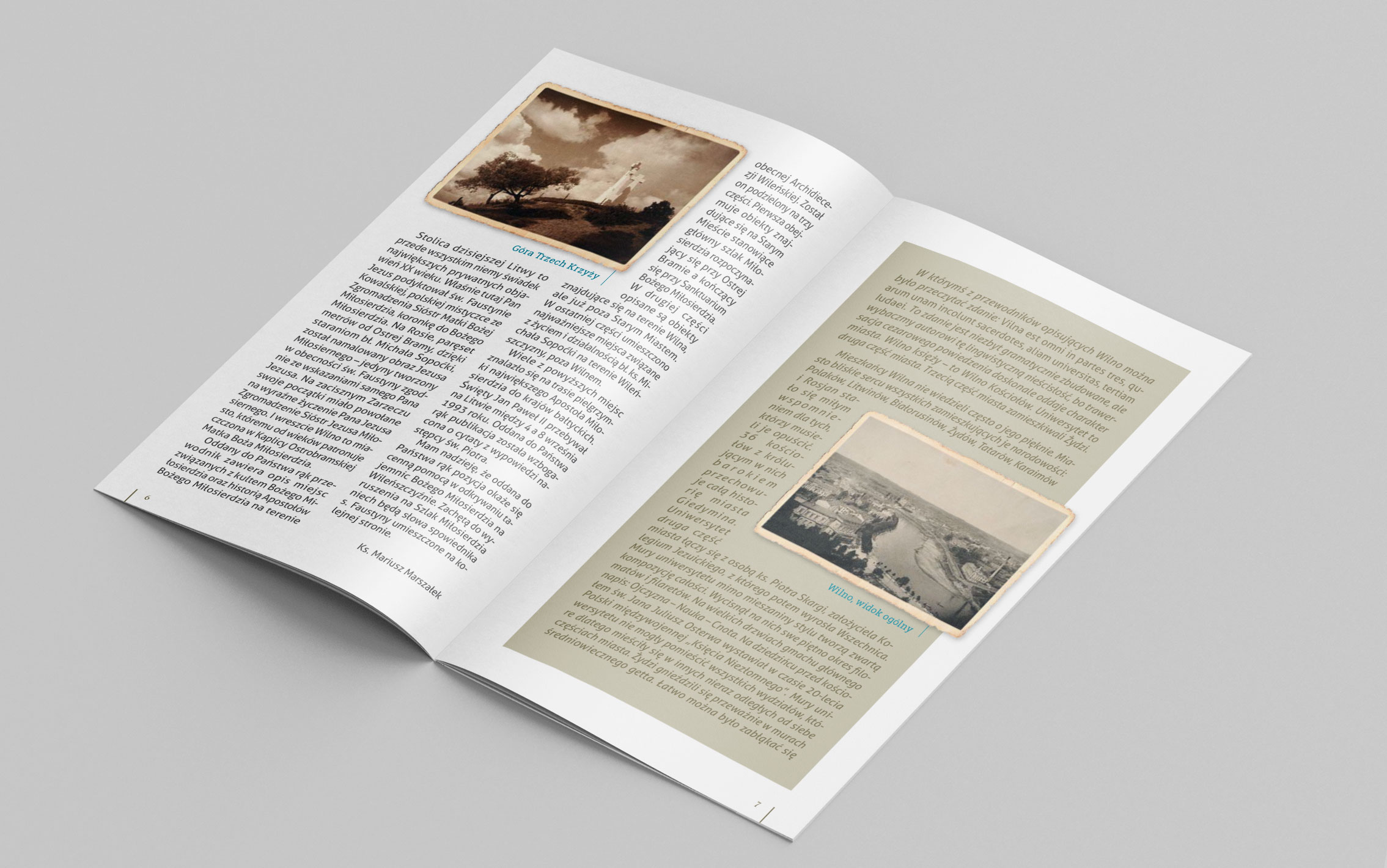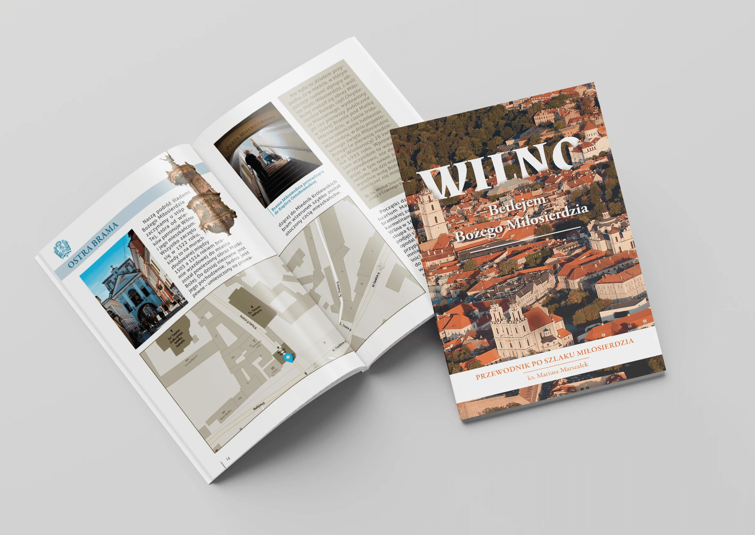 "Wilno, miasto miłosierdzia" to przewodnik prowadzący nas szlakiem wileńskiej architektury sakralnej. Projekt graficzny przewodnika po Wilnie łączy klasyczną elegancję z nowoczesną estetyką, aby w sposób jak najbardziej czytelny przedstawić opisywane zabytki.